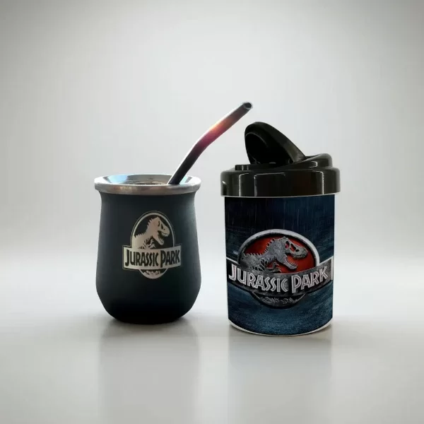 Mate De Acero Pack Jurasick Grabado Y Bombilla + Yerbero