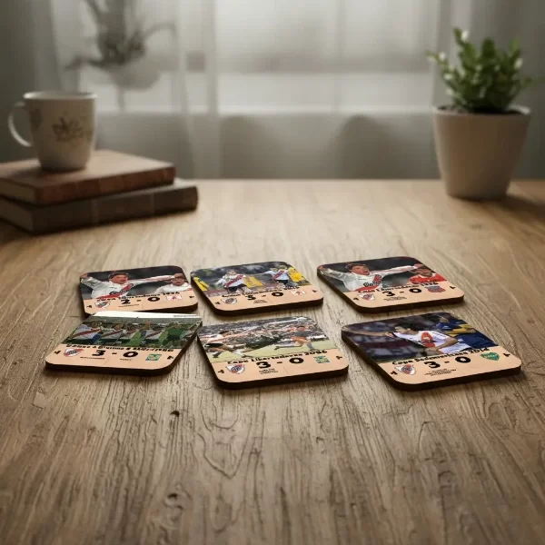 Transforma tu espacio con el set de posavasos de madera brillante diseñado para los verdaderos aficionados. Cada posavaso, con un diámetro de 9 cm, presenta un acabado pulido que resalta la belleza natural de la madera, aportando un toque de nostalgia y estilo a tu hogar.