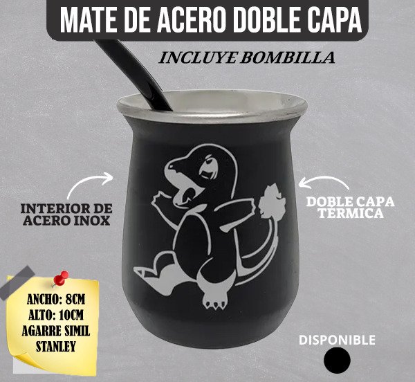 Mate De Acero Simil Stanley Con Bombilla Charmander Pokemon